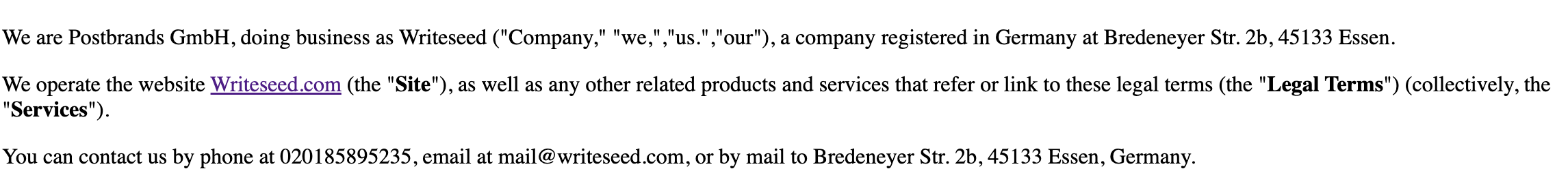 These Legal Terms are governed by and interpreted following the laws of Germany, and the use of the United Nations Convention of Contracts for the International Sales of Goods is expressly excluded. If your habitual residence is in the EU, and you are a consumer, you additionally possess the protection provided to you by obligatory provisions of the law in your country to residence. Writeseed.com and yourself both agree to submit to the non-exclusive jurisdiction of the courts of Amsterdam, which means that you may make a claim to defend your consumer protection rights in regards to these Legal Terms in Germany , or in the EU country in which you reside.